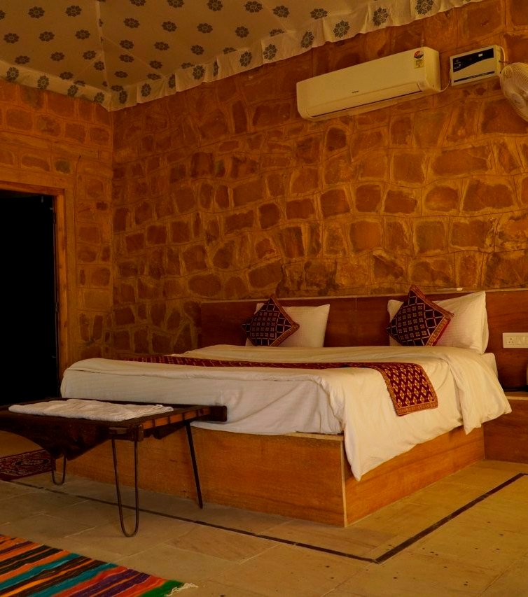 Our four sandstone-built cottages blend naturally into the desert landscape, offering a peaceful retreat with all the comforts you need. Designed for travellers looking for both relaxation and convenience, each spacious cottage comes with air conditioning, a king-sized bed, and beautifully handcrafted interiors inspired by Jaisalmer’s heritage. Enjoy a stay where tradition meets comfort, right at the edge of the dunes.